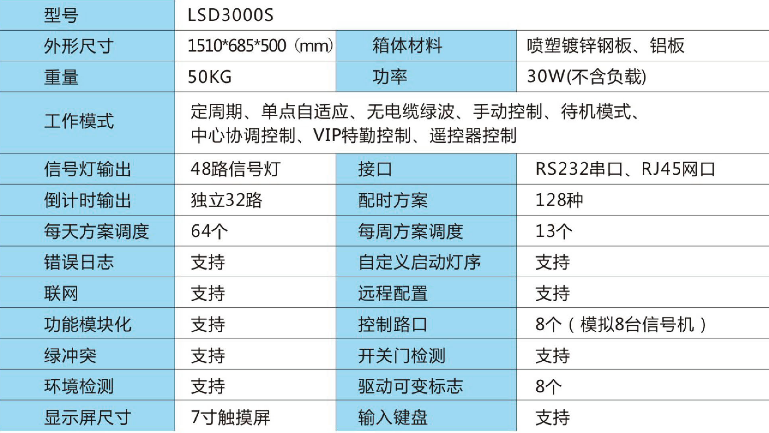 LSD3000S型交通信号控制机采用,稳定、可靠的模块化多处理器、多总线系统结构。采用高速ARM控制器及大规模集成电路,实时运算道路交通信息,如道路交通状态、道路车流量。全部信号机可以组成城城网,完成于指挥中心信息交换。根据城市交通模型进行云计算,计算数据。带有一块7寸液晶触摸显示屏,和一个数字键盘。